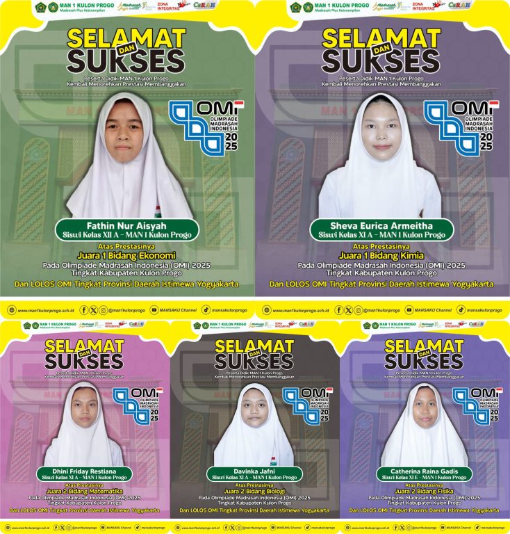 Kulon Progo (MAN 1 KP) – Prestasi membanggakan kembali ditorehkan oleh MAN 1 Kulon Progo dalam ajang Olimpiade Madrasah Indonesia (OMI) 2025. Setelah melalui seleksi tingkat kabupaten yang berlangsung Selasa–Kamis (9–11/9/2025), lima siswa berhasil melaju ke babak berikutnya dan akan mewakili Kulon Progo di tingkat Provinsi Daerah Istimewa Yogyakarta (DIY).