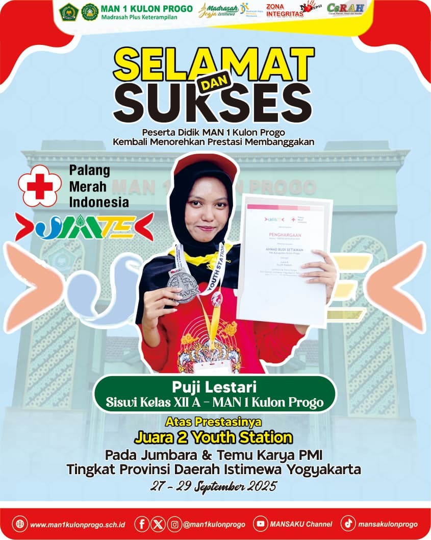 Kulon Progo (MAN 1 KP) – Prestasi membanggakan kembali ditorehkan oleh siswa MAN 1 Kulon Progo. Puji Lestari, siswi kelas XII A, berhasil meraih Juara 2 Youth Station Tingkat DIY 2025 dalam ajang Jumbara dan Temu Karya (JUMTEK) PMI yang digelar pada Sabtu–Senin (27–29/9/2025) di Bumi Perkemahan Jaka Garong, Kecamatan Turi, Kabupaten Sleman.