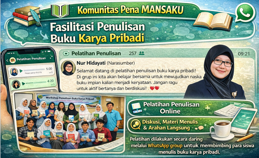 Sementara itu, Koordinator Komunitas Pena MANSAKU, Nur Hidayati, S.Pd.I., menjelaskan bahwa pendampingan melalui grup WhatsApp dipilih untuk menjangkau peserta secara lebih efektif dan berkelanjutan.