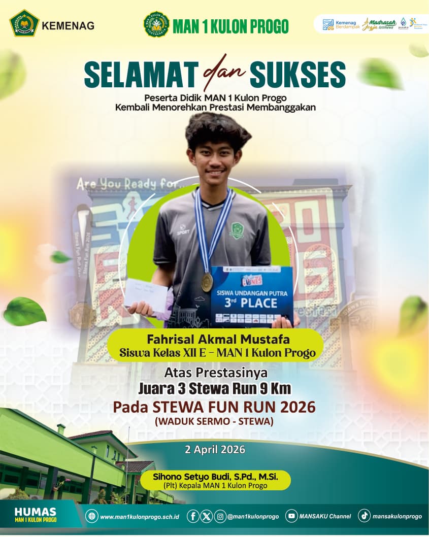 Kulon Progo (MAN 1 KP) — Prestasi membanggakan kembali diraih siswa MAN 1 Kulon Progo. Fahrisal Akmal Mustafa, siswa kelas XII-E, berhasil meraih Juara 3 kategori STEWA RUN 9 Kilometer dalam ajang STEWA FUN RUN 2026 yang diselenggarakan di SMK Negeri 2 Pengasih, Kamis (2/4/2026).