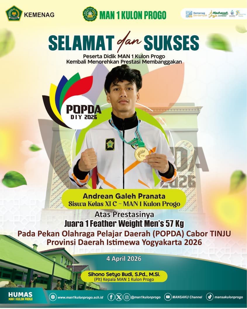 “Prestasi ini tentu sangat membanggakan bagi keluarga besar MAN 1 Kulon Progo. Kami mengapresiasi kerja keras Andrean yang telah berlatih dengan disiplin sehingga mampu meraih medali emas di ajang POPDA DIY 2026. Semoga capaian ini dapat menjadi motivasi bagi siswa lainnya untuk terus berprestasi baik di bidang akademik maupun nonakademik,” ungkap Sihono.